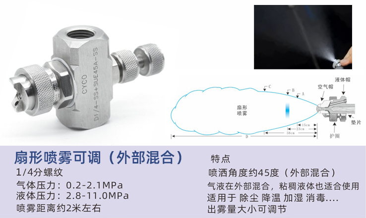 2、可調形空氣霧化噴嘴能夠調節液體流量,在不改變空氣壓力和液體壓力的環境下,同樣可以產生符合要求的噴霧,因此具有很強的適應性