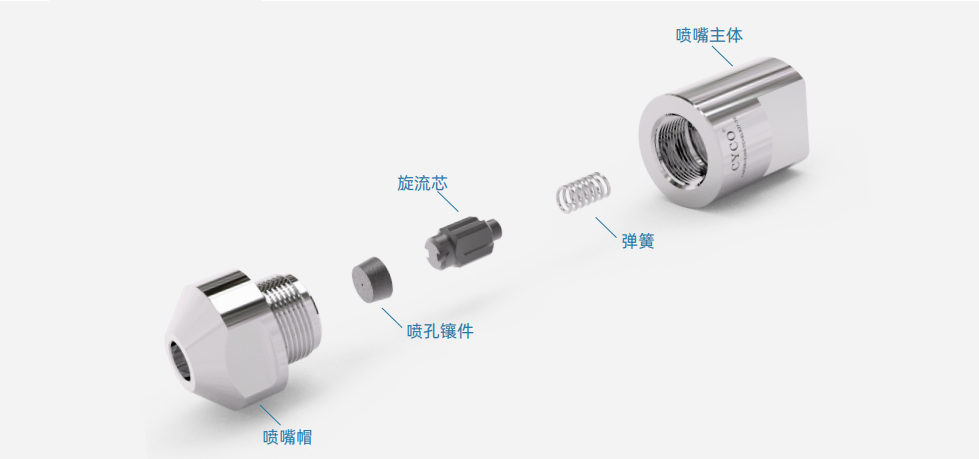 噴嘴主體和噴嘴帽使用303不銹鋼材料制造,噴芯和噴孔 可選用M型和Y型碳化鎢材料,也可根據需求提供其他材料。